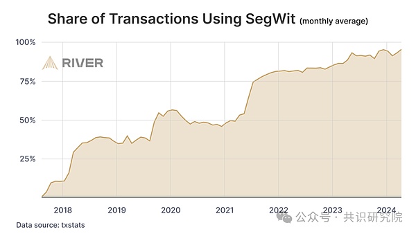 除了直接调整区块容量的方案外,也有开发者提出优化区块空间以提升比特币网络的效率。目前已被广泛采用的方案主要是隔离见证(SegWit)和Taproot。