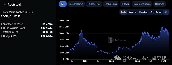 制约Rootstock发展的瓶颈主要有两点,一是侧脸的安全性依赖自身共识,需要用户信任其安全性;二是生态系统不够成熟,缺乏足够的开发者、合作伙伴和用户参与。因此发展多年后,Rootstock的TVL峰值也仅有2亿美元左右。