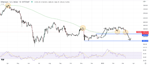 ETH价格短暂跌破 200 日均线,触及 1,408 美元,然后恢复平静,再次接近 1,450 美元。但根据 TradingView, ETH /USD 当天仍下跌约 6%,根据 CoinMarketCap,在过去 24 小时内下跌超过 8%。