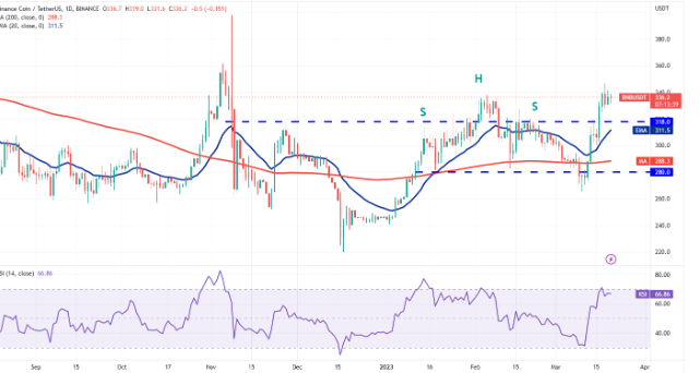 空头在 340 美元上方进行强力防御,但多头并没有放弃太多阵地。向上倾斜的 20 日均线(311 美元)和超买区附近的 RSI 为多头提供了轻微的优势。如果买家将价格推高至 350 美元以上,BNB/USDT 货币对可能会反弹至 400 美元。