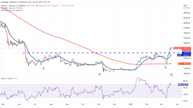上升的 20 日均线(24,463 美元)和接近超买区域的相对强度指数或 RSI 表明多头仍处于控制之中。下一个主要阻力位在 30,000 美元至 32,500 美元之间。