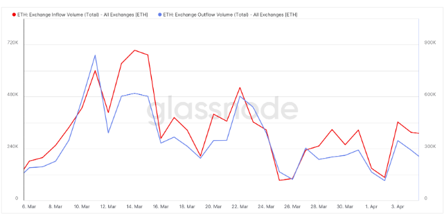 4 月初,外汇流出量略高于流入量,但这种情况很快就发生了变化。因此,过去几天流入交易所的 ETH 数量高于流出量。