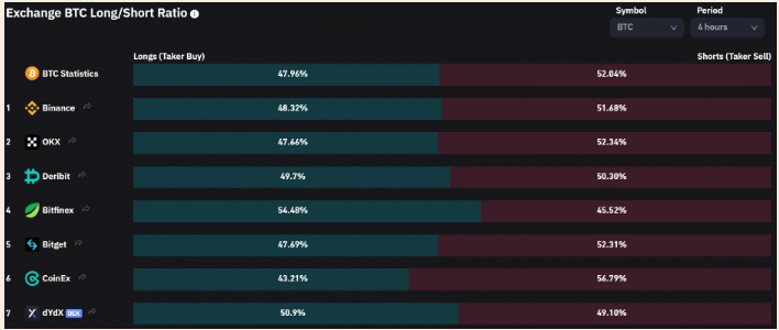 然而,根据Coinalyze 的数据,在过去 24 小时内,价值超过 280 万美元的多头头寸被清算,而空头头寸为 74.2 万美元。此外,交易所 BTC 多空比率显示卖家在 4 小时的时间框架内有轻微的杠杆作用,强化了 BTC 在短期内的看跌前景。