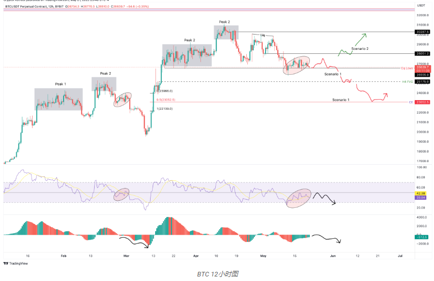 如果历史重演,投资者可以首先期待比特币小幅反弹至 28,051 美元。此举是第一种情况。如下图所示,它将推动 BTC 更早地收集止损买入流动性。在这种流动性变动之后,卖家可能会控制并引发急剧的修正,将早期贪婪的多头困在错误的一边。RSI 和 AO 指标完美地位于各自的平均水平下方,拒绝后回调。第一种情况的第二阶段涉及比特币价格下滑至 25,175 美元和 23,062 美元的支撑位。