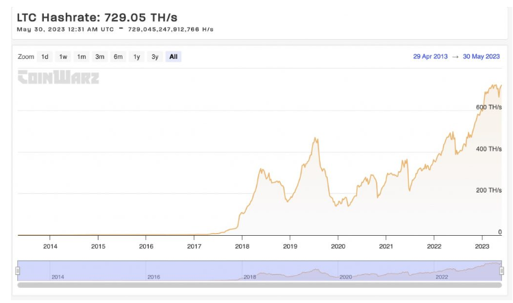 交易激增伴随着网络哈希率的惊人飙升,哈希率指的是专门用于挖掘和保护莱特币区块链的计算能力。哈希率在 2023 年 4 月 11 日达到历史峰值 924.45 太哈希/秒 (TH/s),区块高度为 2,454,983。截至目前,LTC 的哈希率徘徊在 739.03 TH/s,证明了 Litecoin 网络的稳健性和弹性。
