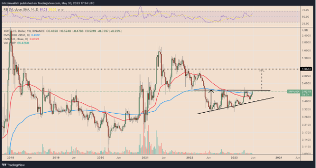 相反,突破水平趋势线阻力可能触发上升三角形反转突破,将 XRP 价格推向 1 美元,如下图所示。