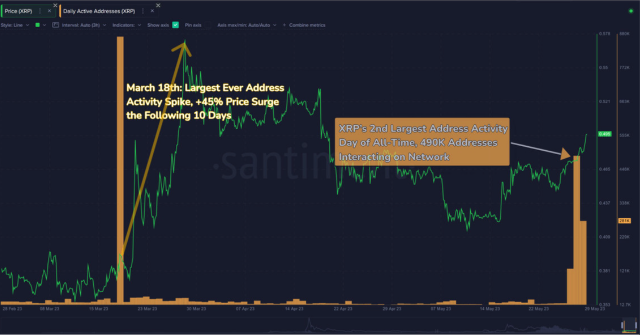 例如,5 月 27 日,大约有 490,000 个地址与 XRP 网络进行了交互。根据数据资源 Santiment 的数据,这相当于 XRP 区块链上的第二大地址活动,距离创纪录的 880,000 个 DAA 计数仅三个月。
