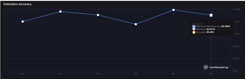 然而,XRP 显示出其韧性,其价格迅速回升,短暂超过 0.52 美元的水平。会发现一个有趣的情况。该社区在预测过去六个月 XRP 的表现方面具有令人印象深刻的 88.76% 的历史准确度。截至2023年5月,其近期准确率为90.49%。这表明 6 月份 XRP 的情绪是积极的。就像 SHIB 一样。让我们看看 SHIB 和 XRP 的表现如何。