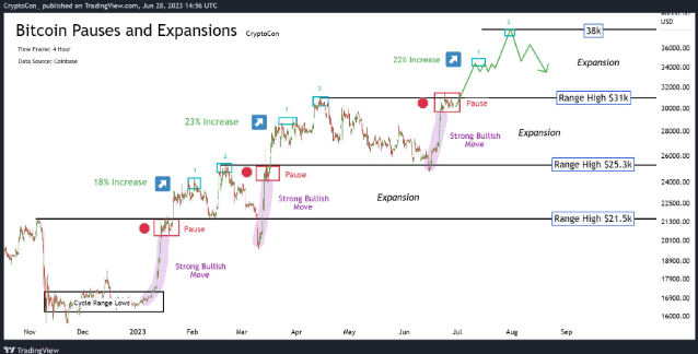 受欢迎的交易商 CryptoCon在推文中写道:“价格从低点开始看涨,在区间高点暂停,然后继续创出年度新高。”