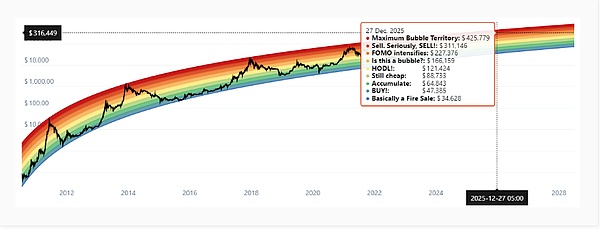 此外,考虑到历史价格走势,比特币可能会在下一个比特币周期中出现大幅上涨,这可能会在 2025 年底前将 BTC 的价格推向新的高度。在之前的减半周期中,BTC 达到了新的价格峰值,约为一年到一年半进入新的减半周期。根据比特币彩虹图(旨在以对数刻度绘制关键支撑位和阻力位),2025 年 12 月 BTC 的交易上限为 425,780 美元,下限为 34,630 美元。